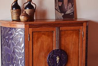 Madera y color berenjena, más un austero toque oriental. El mueble mide 95 cm de frente x 35 cm de profundidad y 85 cm de alto.