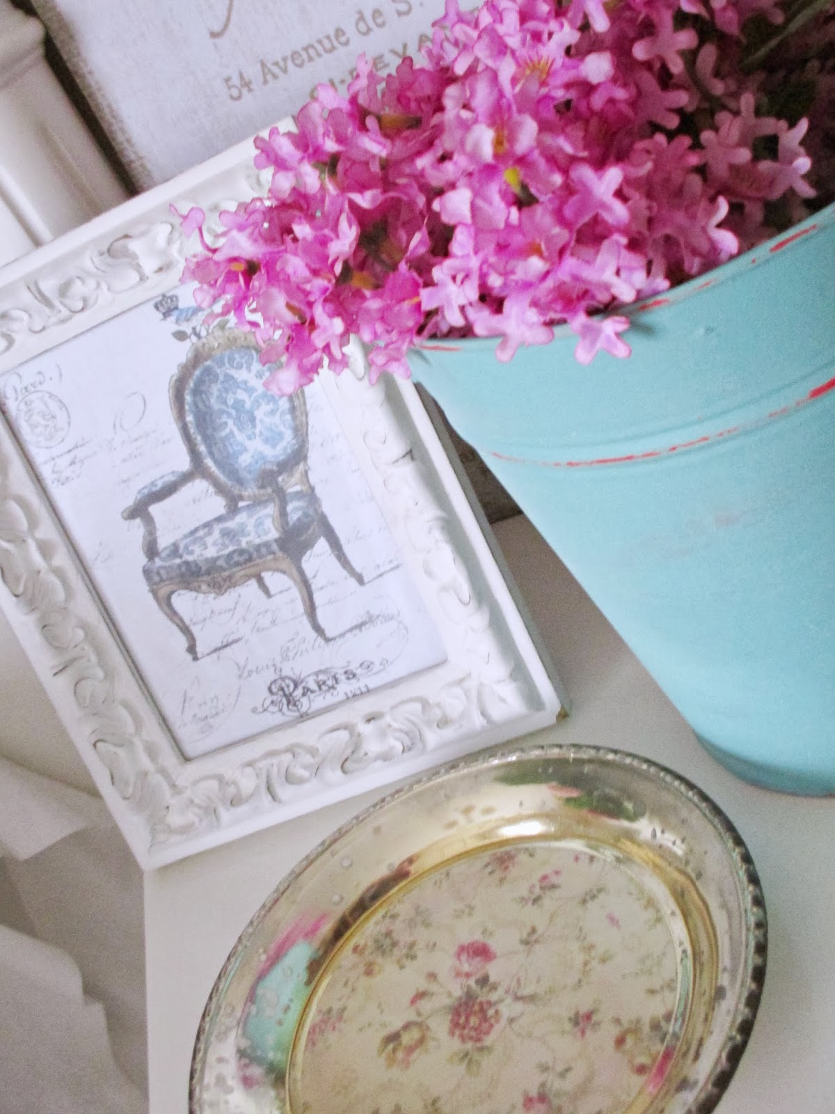 El cubito de zinc lo hice probando dos colores en pintura de tiza hecha por mi.... El marco sufrió un cambio a vintage y le coloqué una lámina muy parisina.