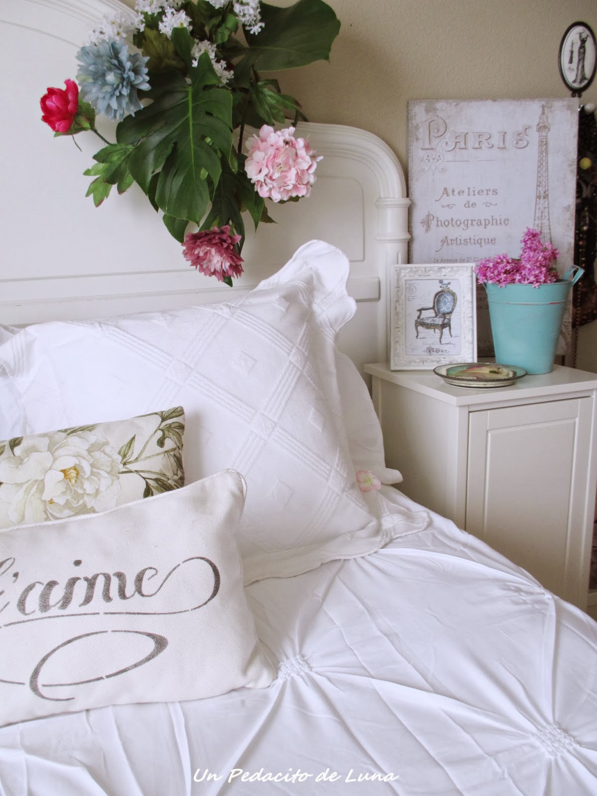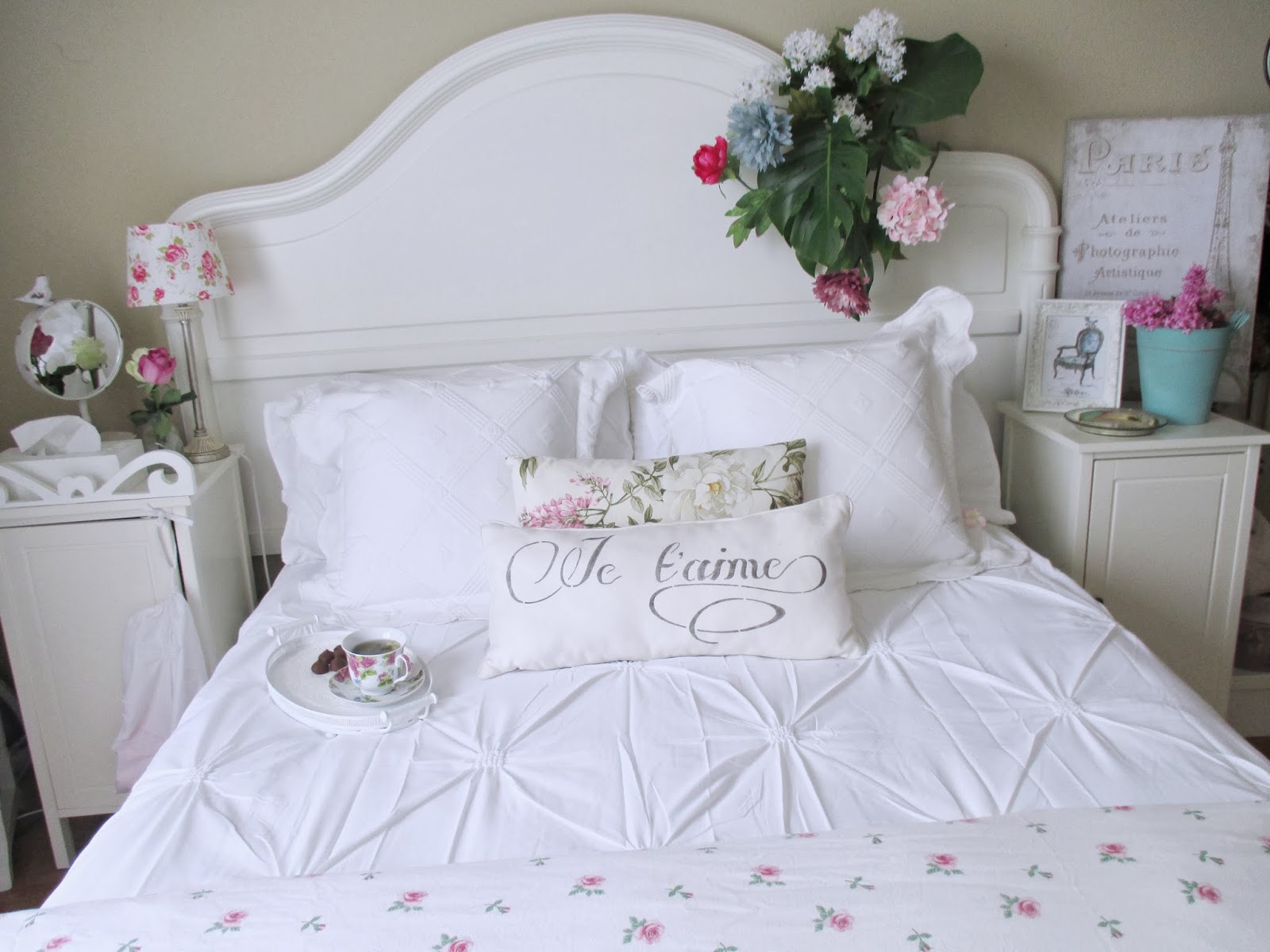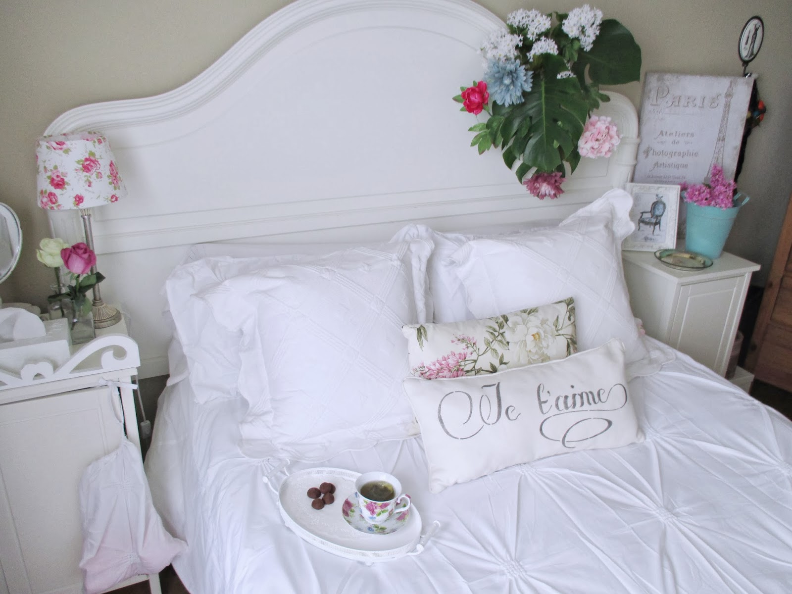 Sábanas frescas, almohadones, unos toques de color aquí y allá, algunos objetos románticos, flores.......Fueron desfilando y acomodándose para componer la escena!!
