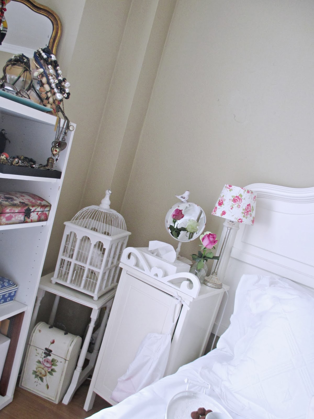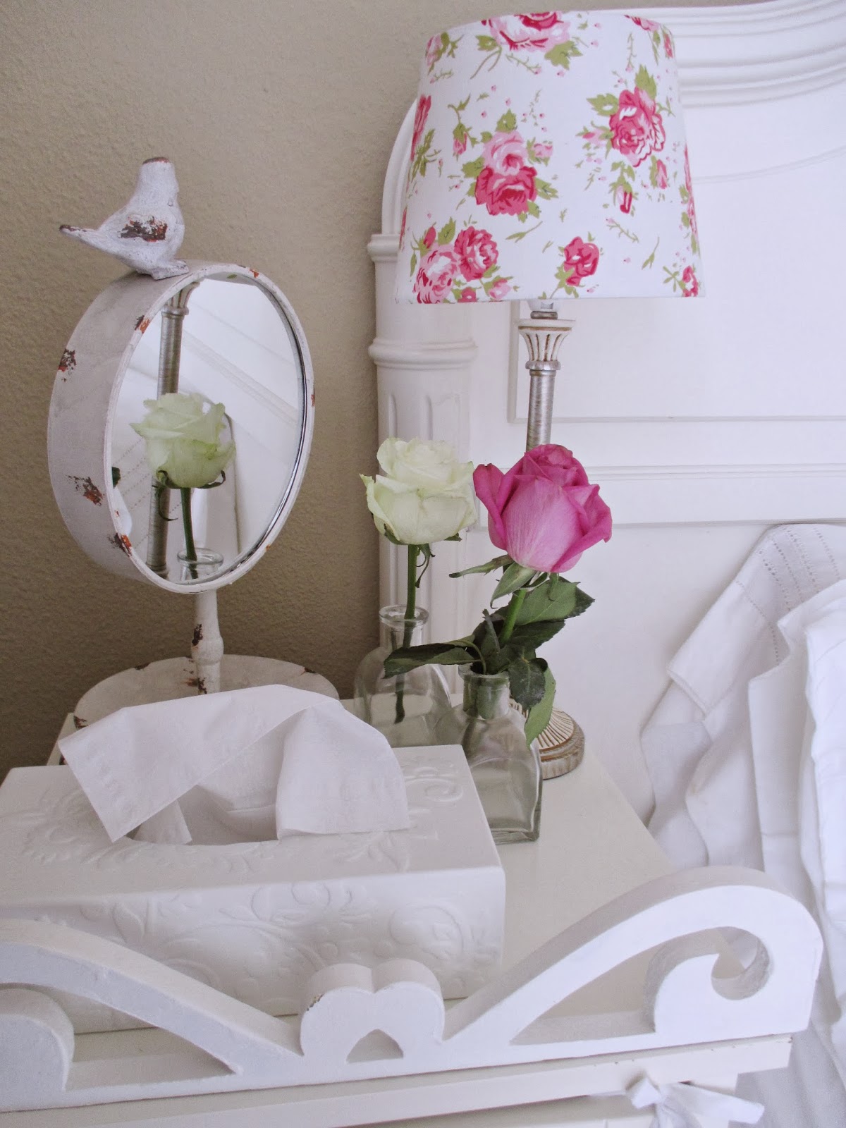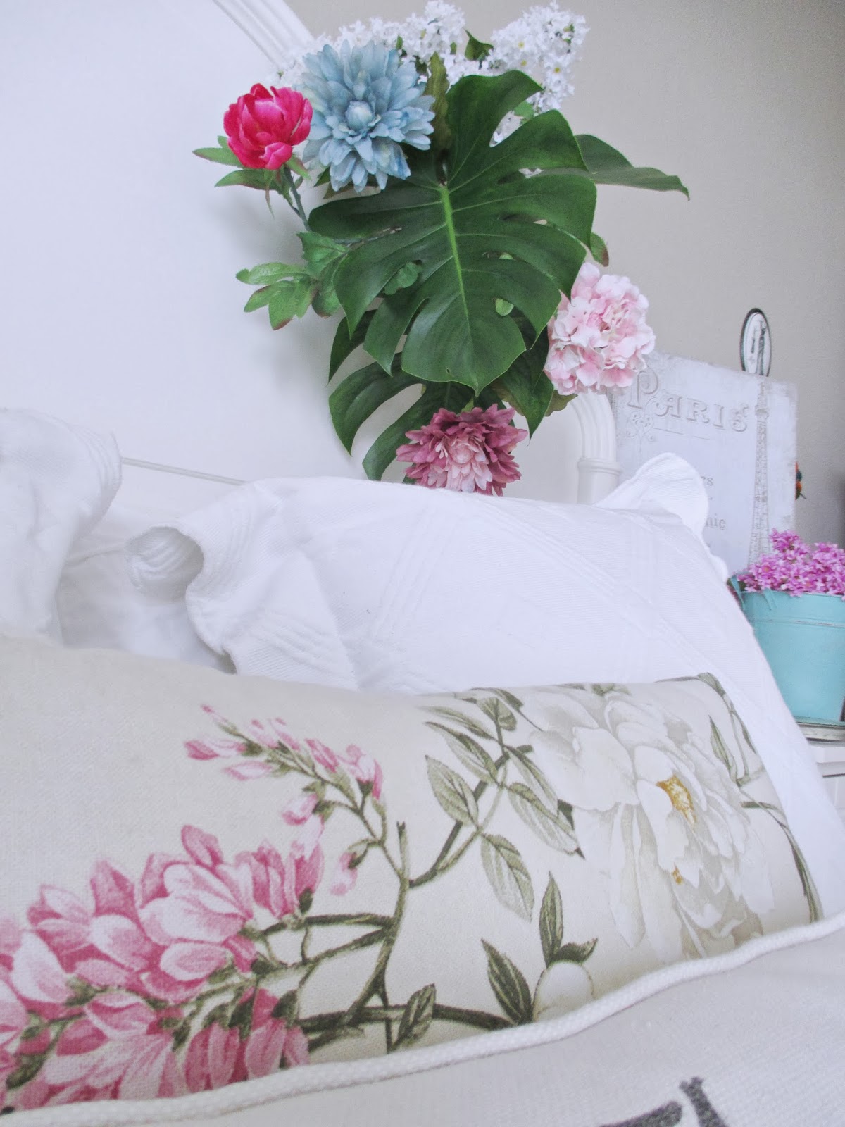 Sábanas frescas, almohadones, unos toques de color aquí y allá, algunos objetos románticos, flores.......Fueron desfilando y acomodándose para componer la escena!!