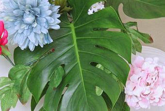 Con unas pocas flores artificiales y hojas naturales de una tropical monstera, pude armar el conjunto.