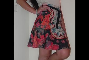 Como os decía, la falda me gustó por su originalidad. Como no es precisamente discreta, la combino con tonos neutros (beige, negro...) aunque una rebeca roja completa mi look.