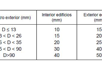 Si nos referimos a las tablas de espesores de aislamiento, las que han sido cambiadas en parte son las que afectan a los fluídos frios (temperaturas entre 0 y 10 grados) . En exterior con una temperatura mínima como esa hay que aplicar un espesor equivalente a 45mm para los diámetros menores de 35 mm, en el caso de las espumas elastoméricas (FEF, reguladas por la EN 14304). En el exterior, como norma general se añadirán 20 mm a los espesores de aislamiento, respecto a la especificación para interior.