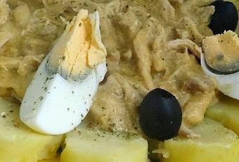 Otro plato típico de la cocina peruana que me enseñó mi amiga Delia. Antiguamente se hacía con gallina, y ahora es más habitual con pollo. Imprescindible usar ají amarillo, ya que le da un sabor muy especial. A ver qué os parece:- Cocer en agua con sal dos medias pechugas de pollo junto con 2 carcasas, 2 patatas con piel, 1 puerro, 1 rama de apio, 1 hoja de laurel y sal, hasta que el pollo esté tierno (unos 45´, retirando las patatas a los 20´). Dejar enfriar las pechugas y deshilacharlas a mano.