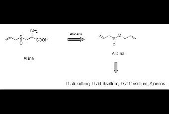 El ajo emite su olor característico cada vez que se “daña”, por ejemplo durante la masticación, un corte, o si lo machacamos; esta es la razón por la cual los dientes de ajo enteros no desprenden ese olor. De hecho, en célula intacta de la aliina y los otros sulfóxidos están confinados en el citoplasma, mientras que su enzima hidrolítica, alinasa, está presente en la vacuola. Es decir, que están en zonas distintas pero con la destrucción de la estructura celular del ajo se libera la enzima y esto provoca la hidrólisis de los sulfóxidos y su transformación en disulfuros y trisolfuros.