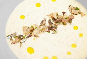 vinagre arroz 10 ml / 30 ml aceite de oliva / 5 ml de salsa de soja / unas gotas de sake / unas gotas de aceite de sésamo / cebollino picadoVamos a usar 20 gr de caballa picada por cada bol de ajoblanco. Presentamos el ajoblanco con tartar de caballa llenando un bol de ajoblanco con la cantidad deseada, esparcimos la caballa por encima y decoramos con gotitas de aceite de oliva.