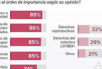 Con una propuesta inicial de siete temáticas sociales, los resultados muestran con claridad las cinco áreas principales que más preocupan a los médicos: un 89% se decantó por el acceso a los servicios sanitarios, situándose muy cerca las políticas migratorias (86 %), el consumo de drogas (85 %), la violencia de género (85 %) y el cambio climático (74 %). En orden decreciente, algo más de un 30% consiguieron los derechos reproductivos (32%), seguido por los derechos del colectivo LGTBIQ+ (29%) y otros problemas sin definir (21%).