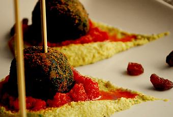 Han sido muchas las variantes y los acompañamientos, aunque las recetas originales siempre consistían en bolas de carnes muy especiadas y acompañadas con diferentes salsas.Curiosamente durante la época del Al Andalus, estas, las albóndigas no faltaban en la mayoría de los festejos, sobre todo en las bodas, al igual que los almojabanas, un postre que aún goza de cierta tradición en algunas zonas del Levante y Aragón.Estas Al Bounduqas de hoy, pertenecen a la cocina sefardí se trata de una receta con muchas connotaciones y ciertas curiosidades ya que la albóndiga en particular, está hecha exactamente igual a la forma que se hacen las espinacas a la catalana, es decir, con piñones y pasas, eso, hace pensar, solo pensar ya que no tengo información para constatarlo, que quizás en los Calls de Catalunya, fuesen los judíos quienes introdujesen esa forma de cocinar las espinacas.La receta original, no es más que unas albóndigas a base de espinacas, especias, piñones y uvas pasas y acompañada de una salsa a base de tomate muy picante, que combina perfectamente con el dulzor de la bola. Hemos querido versionar la receta original, siendo fieles a la albóndiga adaptando la salsa picante y añadiendo un toque de nuestra cosecha con un puré de espinacas, patata y chalota, para darle al conjunto un toque más fresco.Disfrutad de estas Al Bounduqas Sefardies.