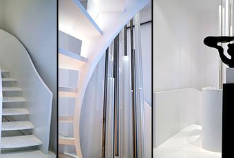 Se respeta la escultura original de la escalera a la que finalmente se aplica un acabado global en color blanco. Para ocultar la balaustrada original, se añaden paneles de madera en DM de 5 y 7 milímetros de grosor pre lacados.