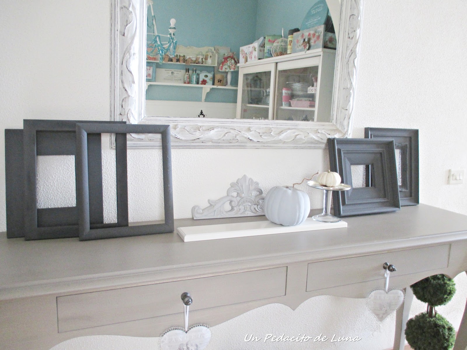 Ahora si, nos vamos al lugar donde montaremos la escena otoñal calabacil.La gran mesa en la entrada que da al comedor se me mostró adecuada y, empecé a incorporar varios elementos.Para empezar, unos marcos que estoy unificando en tono gris graffito para otro trabajillo.