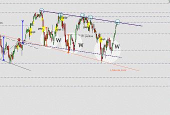 Patrón en W que se confirma para posteriormente alcanzar la parte alta del canal o línea de unión entre máximos relativos de medio plazo (origen en el inicio del año 2013). La lógica pues nos invita a pensar en recortes de cara a las próximas jornadas de Bolsa, tanto en el selectivo como en los principales valores directores componentes del mismo como Banco Santander, Inditex, Repsol o Iberdrola entre otros.