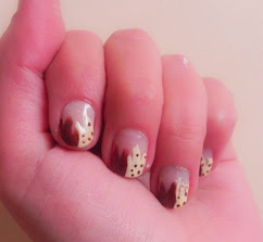 Como les he dicho en entradas previas, pese a mantener una idea general, tenía intención de ir variando detalles de las manicuras. En este caso, esa variación viene dada por la mezcla de tonos: hasta la mitad de cada uña en marrón, y la otra mitad en amarillo suave con topitos del tono compañero. Los detalles están, una vez más, hechos con los esmalte que aquí les reseñaba. Al final, aunque su calidad no es superior, a mi me están dando muchísimo juego como ven.