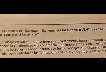 Pongo la foto para que vean que no me lo invento.Cuando trabajé en Batman por primera vez ciertamente había un "modelo" a seguir. En esa época la Continuidad y la coherencia eran importantes. Y yo lo echo de menos... Creo que los lectores pierden interés por los personajes que están constantemente cambiando para satisfacer las limitaciones del nuevo equipo creativo o sus egos (como pueden ver la negrita es mía).Ha llegado el momento de valorar estas palabras porque ya ha pasado tiempo suficiente. Son del, repito, 2006. Antes de las nefandas Invasión secreta y Civil War. Evidentemente el tío fue certero porque al estar dentro veía las cosas mejor que aquellos que se pensaban que los personajes quescribía Bendis eran así, o sea, distintos a como solían ser, porquen realidad eran skrulles. La verdad es que sorprende su elocuencia. Con muy pocas palabras A. Davis tanto vaticinó como describió certeramente los últimos 15 años tanto de Marvel como de DC. Para el género de los Superhéroes ese autor es muy conservador. Si por él fuese sus protas estarían en el país de Nunca Jamás. Serían Peter Panes. No estoy dacuerdo porque los tiempos cambian, las lecturas sacumulan y limitar siempre es excluir. Pero creo que la Continuidad y la coherencia son importantes. Y que lo que no puede ser es que los personajes cambien sólo porque así lo quieren sus guionistas, editores o ejecutivos de turno. Y que no se puede pasar por encima de los deseos de quienes mantienen a los personajes vivos y facilitan que los jóvenes los puedan conocer, y que tampoco se puede exigir quel público aplauda las desfiguraciones, mutilaciones o secuestros perpetrados por las editoriales a los personajes sin que los que coleccionan (que no es lo mismo que seguir en Interné) se lo hayan pedido. A. Davis sequivoca en hacer las cosas como quiere porque entonces nadie que no sea de su generación puede conectar con El clavo y El otro clavo, pero los personajes longevos necesitan cierta imperturbabilidad, y la Continuidad no significa ser prisioneros del pasado sino la obligación dexplicar toda novedad. Es la defensa que tienen los coleccionistas y los autores ante las veleidades de los que escriben por dinero o por ego. En fin, está claro que lo que dice A. Davis es correcto. El problema no son los cambios sino questos se hagan sin fundamento y por razones pasajeras, da igual que sea porque ahora toca este guionista que porque ahora estén de moda los unicornios. A los tontos de turno se les suele llenar la boca diciendo que los superhéroes son los héroes mitológicos actuales. Es parcialmente cierto PERO una cosa que hicieron los antiguos poetas griegos fue conservar la esencia de sus héroes a lo largo de los siglos. Los héroes mitológicos griegos cambiaron a lo largo de los más de mil años questuvieron vigentes en la Antigüedad. Los autores dentonces no regurgitaban, ponían el acento en lo que interesaba en cada época, cambiaban o reinterpretaban los mitos para conseguir una buena historia y añadían secundarios, y la imagen de los mismos fue cambiando según las modas, pero ningún héroe ganó nuevos poderes, cambió su origen o personalidad, fue sustituido por versiones femeninas, etc. Los antiguos poetas griegos respetaban la tradición y justificaban sus innovaciones, y no se dejaban llevar por las modas o el dinero. Por eso más de 1500 años después de la caída del mundo grecorromano nosotros podemos reconocer en el arte clásico (visual y escrito) a ntros héroes mitológicos griegos pese a ser ya recreaciones bastante libres. Los personajes longevos han de ser sólidos no líquidos. El heroísmo es permanecer, aguantar, perseverar; no fluir. Es tener principios y modestia; no ser caprichosos y pedantes. Es dar seguridad no negarse para recibir aprobación.