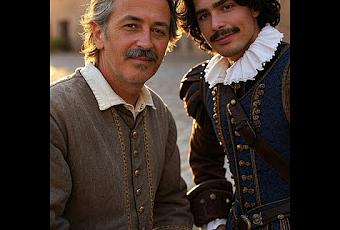 ¿Puedes hacer una ilustración que reúna al Capitán Alatriste (personaje de Arturo Pérez-Reverte) y a D'Artagnan, el célebre mosquetero creado por Dumas? Alatriste debe aparentar unos 50 años. D'Artagnan, unos 25 años. Alatriste debe vestir con pobreza pero dignidad. D'Artagnan, como un mosquetero del Rey de Francia, con ropajes caros.