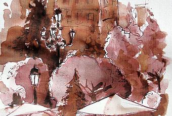 Van aquí algunos dibujos sobre lugares distintos de Albacete. Tintas y pincel de agua. Unos con estilográfica, otros con plumilla. Sigo probando las tintas de color marrón, con la excepción del siguiente, hecho con una tinta artesana de mi amigo Carlos. Es color índigo, un azul oscuro transparente cuando se aplica y que va oxidándose poco a poco. Es una tinta excelente, con un color profundo y que conserva transparencias del papel. Es adecuada tanto para escribir como para dibujar.