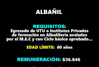 Requisitos Excluyentes:A. FORMACION:Egresado de UTU o Institutos Privados de formación en Albañilería avalados por el M.E.C y con Ciclo básico aprobado.A VALORARA. FORMACION: Títulos, Cursos y Talleres de la especialidad requerida.B. EXPERIENCIA: 1 año mínimo en trabajos similares y de similar complejidad.COMPETENCIAS CONDUCTURALES Y/O FUNCIONALES- Trabajo en equipo- Respeto de la jerarquía- Planificación y organización