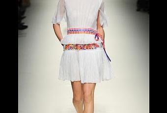 Alberta Ferreti presenta una colección llena de flores, rayas y tiras de colores que adornan los vestidos, sobre todo los blancos.