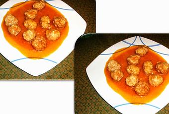 Freímos la cebolla cortada muy fina en la olla y añadimos el tomate para freírlo un poco, y añadimos las albóndigas