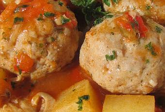 Sacar las albóndigas y patatas a una olla , cubrir con la salsa y dar un hervor.