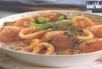 Ingredientes150 g de carne de cerdo picada300 g de carne de ternera picada500 g de calamares limpios150 g de guisantes1 cebolla2 tomates1 diente de ajo1 huevo1 rebanada de pan200 ml de vino blancoLeche300 ml de caldo de pescadoPerejilHarinaAceite de olivasal y pimienta molida