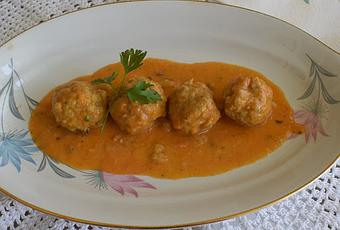 Tritura en el vaso de la Thermomix, la zanahoria, ajo, manzana pelada, pan y perejil durante 5 segundos, velocidad 7. Añade la yema de huevo, leche, nuez moscada y canela. Programa 20 segundos, velocidad 3. Añade la carne picada de cerdo y programa 10 segundos, velocidad 3.Hecha la mezcla en un bol, forma las albóndigas y reboza en harina. Ponlas en un plato o recipiente bajo, previamente untado con aceite; colócalas en círculos concéntricos hasta ponerlas todas. Si tu microondas es pequeño lo tendrás que hacer en dos veces. Programa 5 minutos, máxima potencia. Espera un minuto antes de abrir la puerta. Saca y reserva.