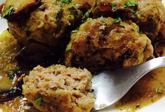 Albóndigas con champiñones en salsa. Volvemos a las albóndigas, esas bolitas de carne que normalmente se presentan retozando en una salsita rica que hacen las delicias de toda la familia y en especial éstas que os presento, preparadas con una crema de champiñones y cebolla pochada que se tritura y se mezcla con la carne picada y nos salen unas albóndigas de vicio, jugosas y con un sabor riquísimo..., luego las acompañamos de una salsa muy "untable" por lo que os auguro, si las probáis, que van a permanecer por mucho tiempo en vuestro recetario ya que el resultado merece la pena, son fáciles de preparar y como la mayoría de los platos con salsa el reposo les viene fenomenal y os aguantan en la nevera unos días. Aquí cada vez que nos ponemos a diseñar "esferas" comestibles preparamos un montón, así que unos cuantos días le damos a la bola o congelamos.