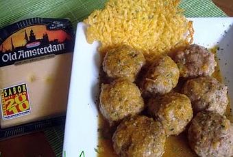 La empresa BeRepublic me ofreció amablemente enviarme unas muestras de queso OLD AMSTERDAM, que acaba de recibir el premio "Sabor del año 2010", para probarlo y preparar una receta con él. Bueno, pues aquí está la receta, que espero os guste a todos, y el queso, con lo queseros que somos en casa, nos ha encantado. Os animo a que lo probéis si os gustan los quesos fuertes. El plato quedó delicioso; las albóndigas muy tiernas con el trocito de queso dentro, y la teja de queso crujiente: una combinación riquísima!- Preparar la masa de albóndigas mezclando 1 kg. de carne picada, 2 rebanadas de pan de molde remojadas en leche, ½ cebolla y un diente de ajo picados, 2 huevos, sal, pimienta y perejil. Dejar reposar media hora. Formar las albóndigas poniendo en su interior un cuadradito de queso “Old Amsterdam”; pasar por harina y freír en aceite. Reservar sobre papel de cocina.