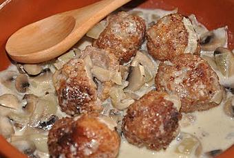 Añadimos los champiñones bien limpios y cortados a gusto, cuando hayan soltado todo el agua y se haya reducido, añadir sal y pimienta, las albóndigas y la nata.