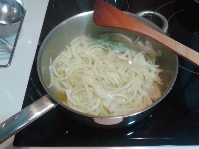 1.- Cortamos una cebolla a juliana y la ponemos en la cacerola con un poco de aceite.