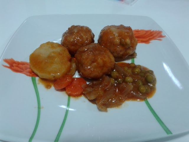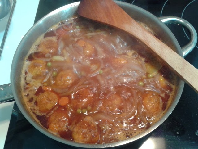 7.- Añadimos aquí ahora, las albóndigas, la patata y zanahoria partida a rodajas y los guisantes.