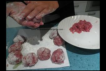 Mientras, formamos las albóndigas, las pasamos por harina.