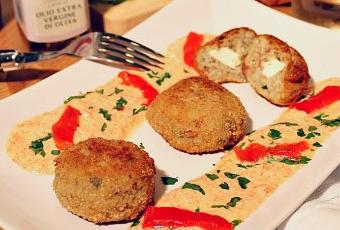 Artículo original: Albóndigas de berenjena y jamón, con corazón de burgos y salsa de miel y pimientos ~ La ragazza col mattarello