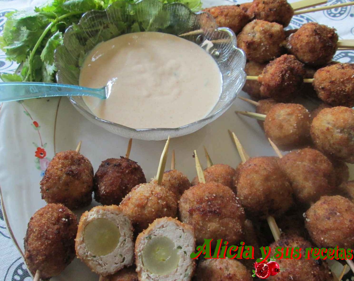 Servimos las albóndigas ensartadas en pinchos o palillos acompañadas de la salsa picante, a la que añadimos un poco de cilantro fresco picado.