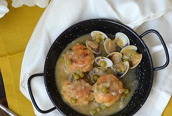 para la salsa:perejil1/2 cebolla1 diente de ajo1 cucharada de harina50 ml de vino blancocaldo de pescado almejas250 gr de guisantessal aceite oliva