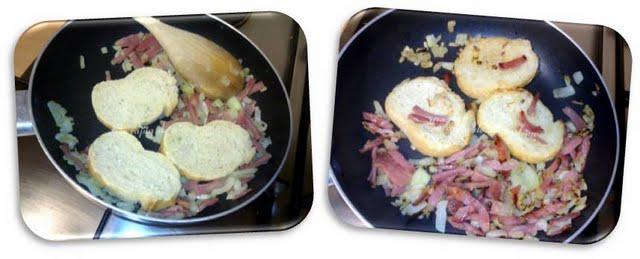 Mientras preparamos la salsa salteando en un chorrito de aceite la cebolla muy picada con el jamón en tiras.