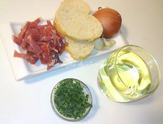 Una vez espesita colamos y separamos del jamón. Reservamos. Picamos el pan, los ajos y el perejil para la salsa.