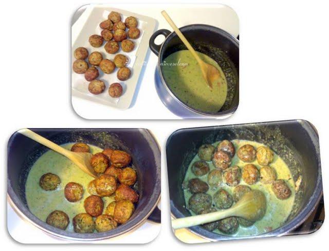Preparamos las albóndigas, las freímos vuelta y vuelta hasta que doren en abundante aceite caliente.