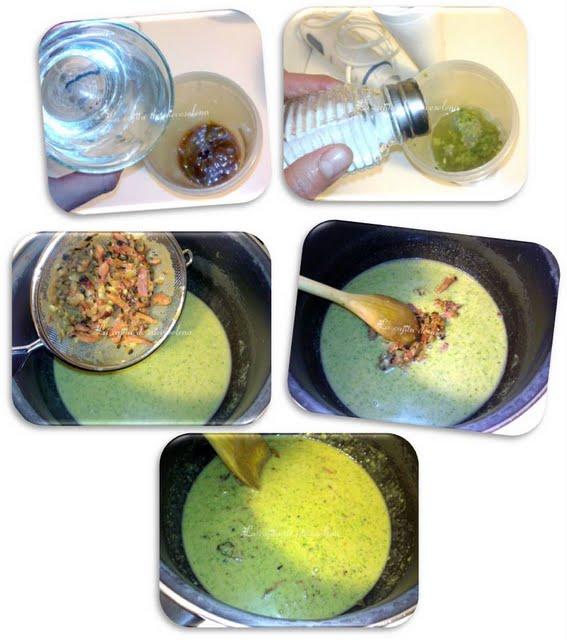 Ponemos en un vaso batidor la salsa de vino, el majado, un vasito de agua y un poquito de sal y batimos. Vertemos la salsa en una cazuela junto con las tiras de jamón, removemos y reservamos.