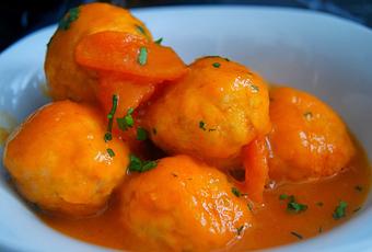 Se hace con ternera y cerdo, pero yo la he adaptado y la he elaborado con pollo. Cogemos la carne y la condimentamos con huevo, perejil, sal y ajo y formamos las bolas. Si las hacéis de ternera y cerdo, meterles también miga de pan machacada con leche para que estén más sabrosas. Después las freimos ligeramente en aceite de oliva para sellarlas.