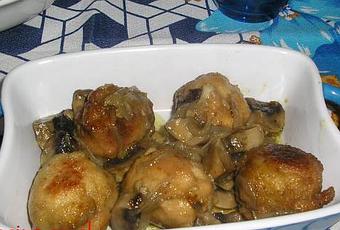 Me había encontrado con la receta de albóndigas en esta salsa en una revista, pero no eran de pollo. La receta era para hacer con carne de ternera. La cosa fue que en la nevera tenía una poca carne picada de pollo que me sobró de hacer unas hamburguesas. Ya se sabe que la carne picada se estropea pronto y la de pollo aun más. Así recordé la receta de albóndigas en salsa de champiñones, compre los champis y me puse a hacer las "mongas" es como llamamos a la albóndigas desde que mi hijo era pequeño y no le salia decir ese nombre.......nos hizo tanta gracias que ahora en mi casa se llaman así jajaja. Me salieron bastante mas de las que yo contaba y tuve para la cena de los cinco. No las tenía todas conmigo de que les gustara esta salsa, así que pensé que todo serían excusas. Hubo caras raras cuando las presenté en el plato. Esta salsa se queda un tanto oscura y la verdad en el plato no da el mejor aspecto. Pero luego sorprende muchísimo. Tanto que gracias que como vos digo me cundió lo que parecía poca cantidad de carne, porque todos quisieron repetir. Así que será una receta que se quede en el recetario mas habitual de mi cocina. Porque de hecho yo, ya están diciendo que cuando las repito.