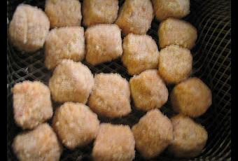 INGREDIENTES: 400 gramos de pollo picado, 1 cebolla grande, 2 dientes de ajo, apio, puerro, 1 zanahoria y media, ½ calabacín, 350 ml de caldo, 100 ml de vino blanco, 1 huevo grande, 1 cucharada de perejil fresco picado, 1 cucharada de pan rallado, colorante alimenticio, 1 hoja de laurel, aceite de oliva, harina de trigo, sal, romero, ajo en polvo y estragón. ELABORACIÓN:Dorar el ajo y la cebolla que hemos picado bien previamente. Esperar a que se enfríe y luego mezclar con la carne de pollo que ya hemos molido al gusto y el perejil picado. Yo le incorporé un poco de zanahoria que nos gusta mucho. En un recipiente tenemos el huevo, la sal, 1 cucharada de pan rallado. Incorporamos la mezcla anterior e intentamos obtener una masa homogénea. Acto seguido comenzamos a darles forma y pasamos por harina. Dependiendo del tamaño te saldrán más o menos cantidad, en mi caso 20 Lo siguiente que hice fue dorarlas un poco en la freidora y dejarlas escurrir bien.