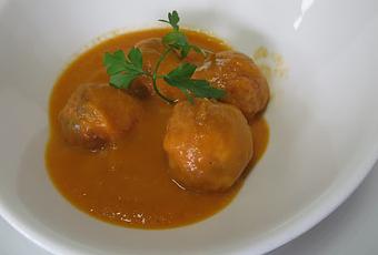 ELABORACIÓN:Se deshuesa el pollo y se pasa por la picadora de carne. Se mezclan todos los ingredientes de las albóndigas, se hace una masa homogénea y se les da forma. Se pasan por harina y se fríen en abundante aceite de girasol. Se reservan.