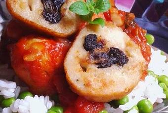 INGREDIENTESPARA 4 PERSONAS1 PECHUGA ENTERA DE POLLO.1/2 CEBOLLA.SAL Y PIMIENTA MOLIDA.NUEZ MOSCADA.HINOJO.200 GR DE CIRUELAS PASAS.1 DIENTE DE AJO.1 HUEVO.PAN RALLADO.HARINA. MIGAS DE PAN.1/2 VASO DE LECHE.ACEITE DE OLIVA VIRGEN PARA LA SALSA 500 ML DE TOMATE TRITURADO.1 CEBOLLA.ALBAHACA FRESCA.1 DIENTE DE AJO.1 VASO DE VINO BLANCO .SAL.1 HOJA DE LAUREL.ACEITE DE OLIVA VIRGEN. PARA LA GUARNICIÓN1 VASO DE ARROZ.200 GR DE GUISANTES.SAL Y HOJA HOJA DE LAUREL.ACEITE DE OLIVA VIRGEN.