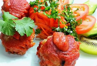 8. Colocamos las albóndigas en un recipiente apto para el horno y lo cubrimos con la salsa. Horneamos las albóndigas durante 10-15 minutos.