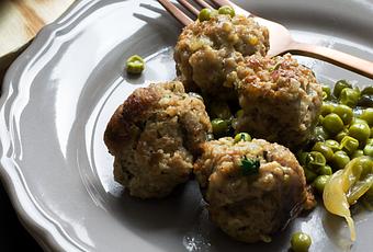 - En el aceite de freír las albóndigas y salteamos el tomillo, el ajo y la cebolla durante unos 3 minutos. añadimos los guisantes, el zumo de limón, el caldo y salpimentamos ligeramente (en caso necesario).