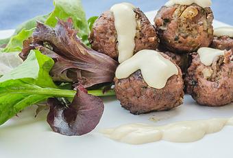 Para emplatar podemos acompañar de un poco de hojas verdes junto con las albóndigas y las bañamos con la salsa de queso.