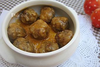 No he querido innovar ni hacer cambios en su receta, tan solo he prescindido del ajo en las albóndigas (ya que siempre las hago así) y solo he realizado unas ligeras modificaciones en la salsa a gusto de los de casa: simplemente he puesto un poco menos de pimentón y he prescindido del azafrán. Y ahora paso a explicaros la receta por si, como a mi, os apetece también preparar estas ricas albóndigas y su salsita para mojar pan y no parar!INGREDIENTES (24 uds.):* Albóndigas:- 450 gr. de carne de ternera picada- 1 huevo L- 1 trozo de pan del día anterior (sin corteza, sólo la miga)- 2 dientes de ajo (opcional)- Leche- Harina para rebozar- AOVE (Aceite de Oliva Virgen Extra)- Sal, pimienta y perejil* Salsa:- 1 cebolla- 1 cucharada de harina- 1 vasito de vino blanco- 2 vasos de agua- Media cucharadita de pimentón- Unas hebras de azafrán (yo no le puse)- Sal- AOVEPREPARACIÓN:- Primero preparar las albóndigas, para ello salpimentar la carne picada.- Añadir perejil picado al gusto y el ajo (si se desea).- Empapar bien el pan en leche, incorporar a la carne.- Batir el huevo con una pizca de sal, añadir y mezclar bien.- Tapar con papel film y dejar reposar media hora en la nevera.- Hacer bolitas con la carne (yo las debo hacer un poco más pequeñas que Gemma porque me salió la misma cantidad de albóndigas que a ella pero yo usé un poco menos de carne picada, jeje!).- Enharinar.- Freír en AOVE caliente hasta que empiecen a dorarse.- Reservar sobre papel de cocina para que se absorba el exceso de acite.- Hacer la salsa: picar finita la cebolla y pochar en una sartén con un poco de AOVE y una pizca de sal.- Añadir la harina y tostar.- Incorporar el vino, reducir sin parar de remover.- Añadir el pimentón (y el azafrán tostado si se quiere incluir) y, a fuego bajo (para que no se queme ni se pegue), remover un poco.- Incorporar el agua y cocer, a fuego medio, durante 10 minutos.- Si se desea, triturar la salsa (yo la batí un poco con la batidora).- Incorporar las albóndigas y cocinar unos 10 o 15 minutos más.