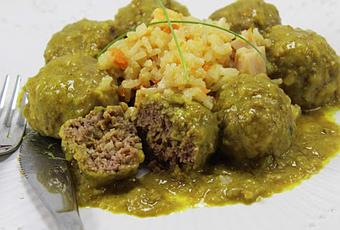 1- Majar los ajos y perejil, remojar el pan en la leche, añadir a la carne junto al huevo, 1 cta. café de sal, pimienta, nuez moscada y 1 cta. cafe de curry y mezclar bien. (Podéis macerarla unas horas, así toma más sabor). Formar las albóndigas pasándolas por harina, sacudiendo el exceso y con un poco de aceite dorar en menú freír en dos tandas. Reservar.