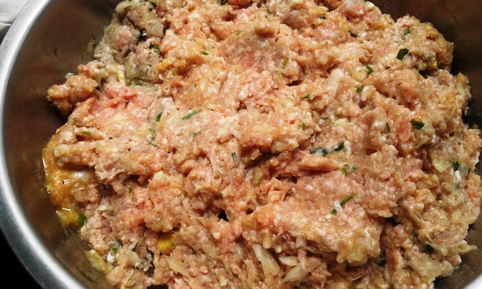 Pela la cebolla y el ajo y ponlos en el vaso junto con el perejil. Pica con velocidad 5, 4 segundos. Añádelo a la carne y remueve bien agregando la miga de pan previamente mojada en leche, la sal, pimienta. Agrega la /2 pastilla de caldo desmenuzada y las yemas de huevo .