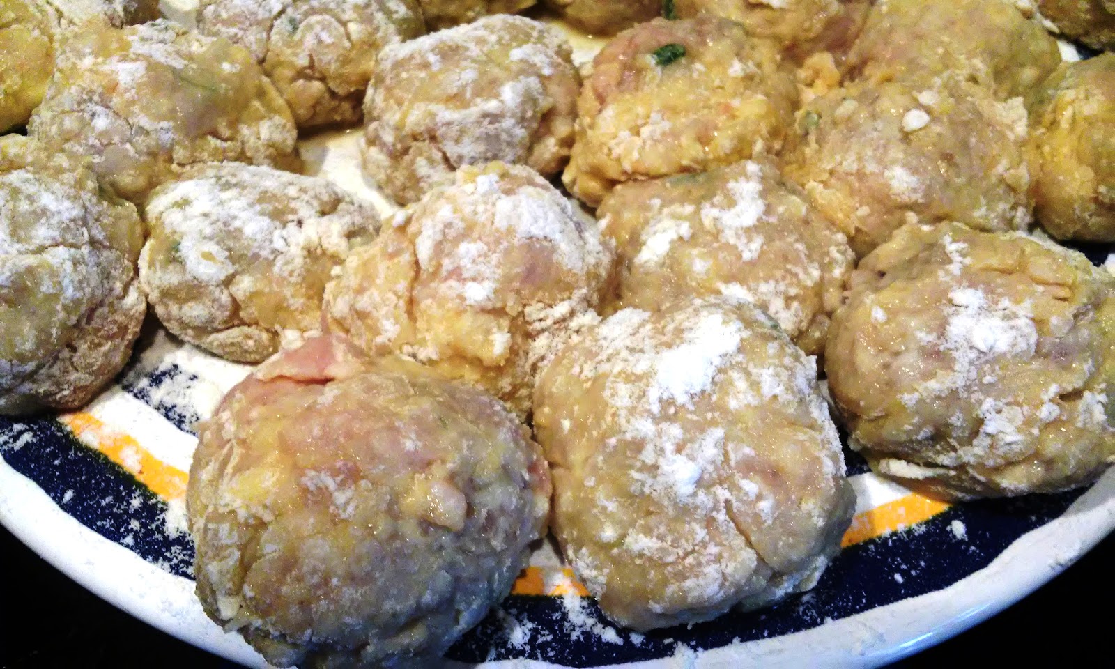 Haz las bolitas rebozándolas en huevo batido y harina. Fríe en abundante aceite de oliva y reserva encima de un papel absorvente para quitar el exceso de aceite.